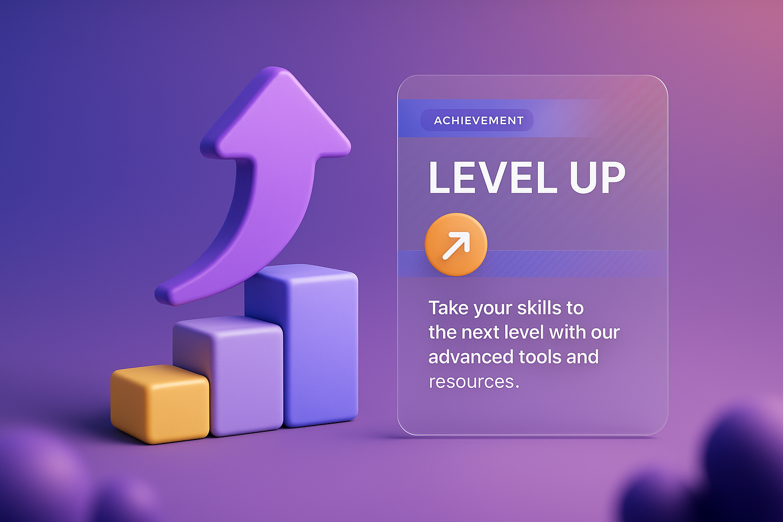 A vibrant 3D illustration featuring upward arrows and colorful blocks, symbolizing progress. The design includes a transparent information block with motivational text, enhancing the theme of skill advancement.