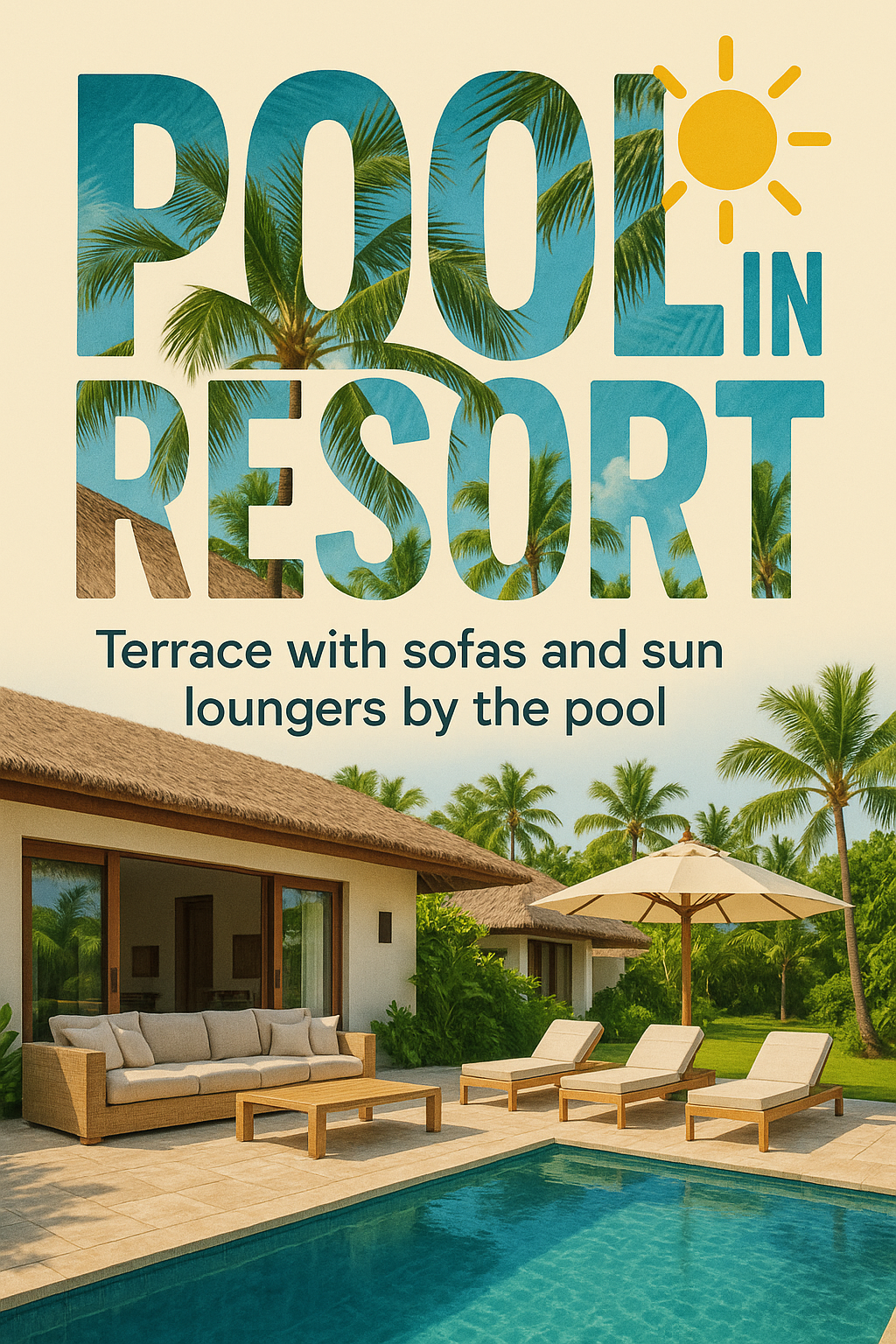 A visually appealing image showcasing a luxurious resort pool area with sofas and sun loungers, perfect for travel marketing and vacation promotions.