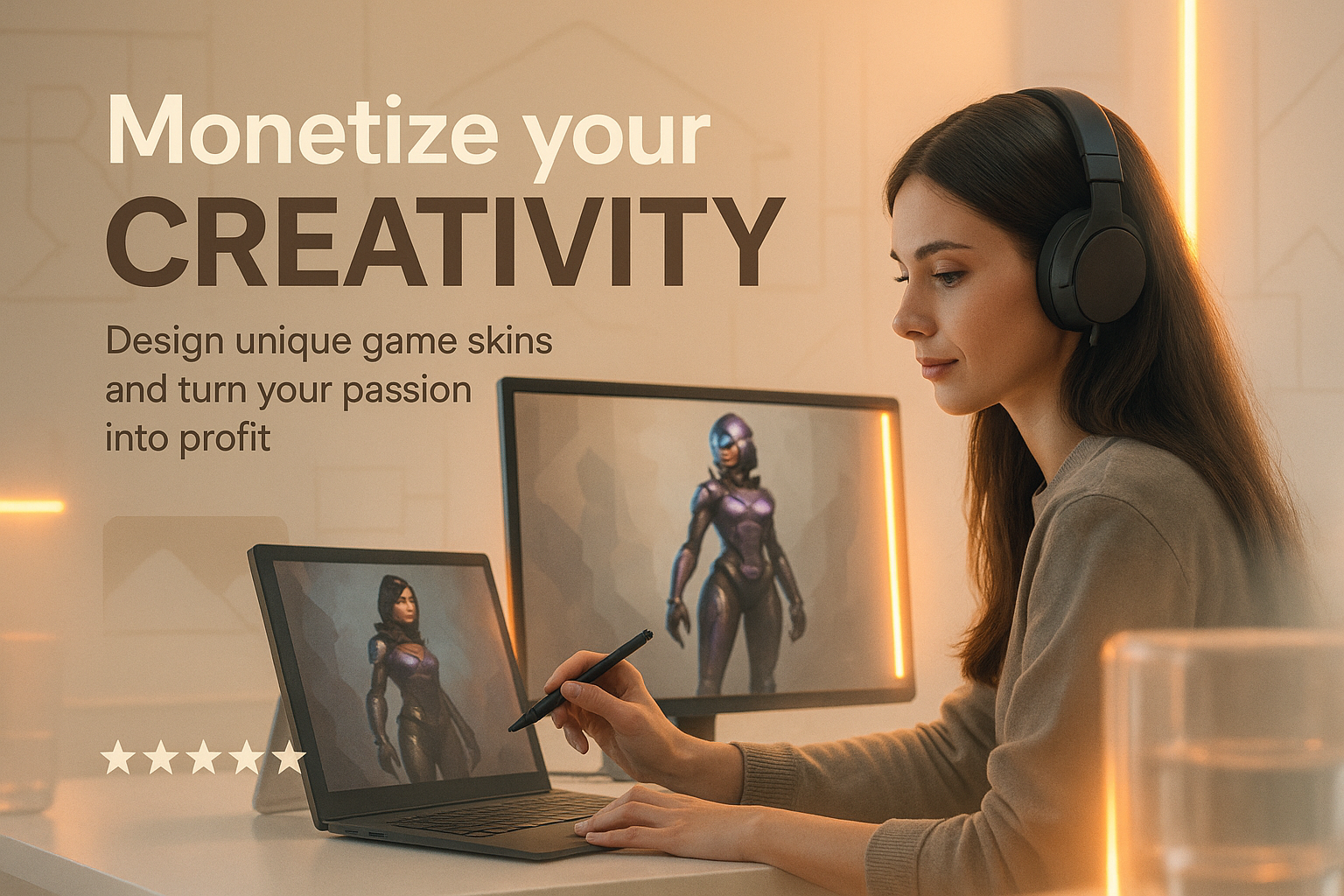 /Collection: /by davooda/Type: PNG/A modern workspace illustration showcasing a designer creating game skins on digital devices, emphasizing creativity and monetization in a sleek and inspiring environment.