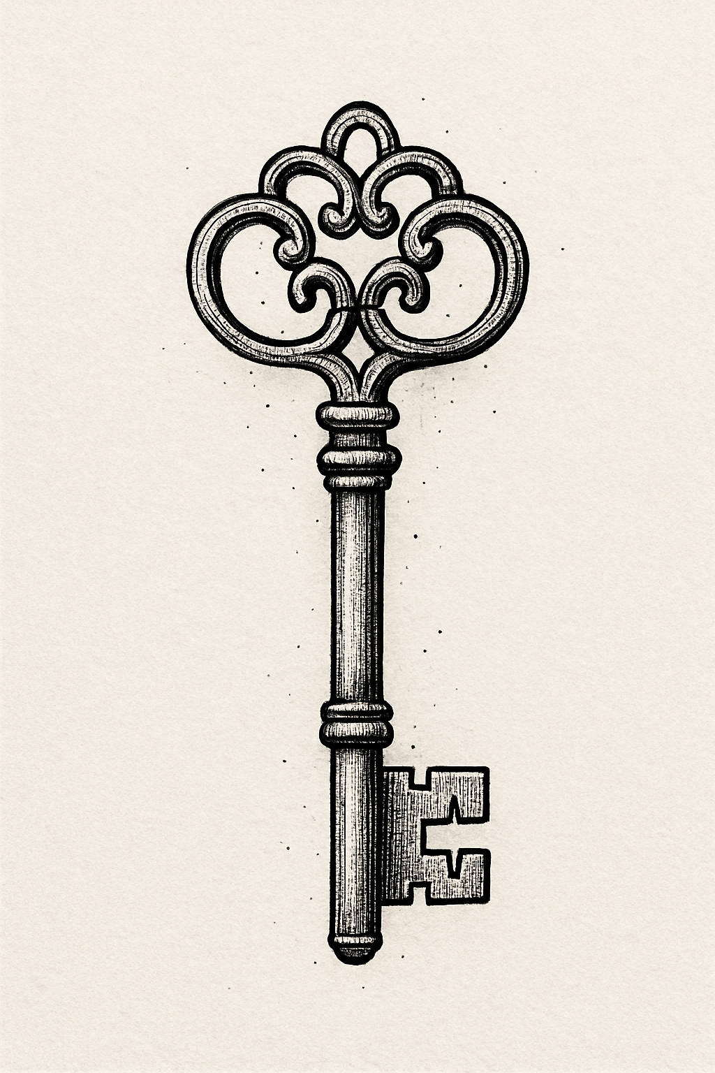 A detailed illustration of a vintage key, showcasing intricate designs and a classic style. Ideal for use in art prints, invitations, or decorative elements.