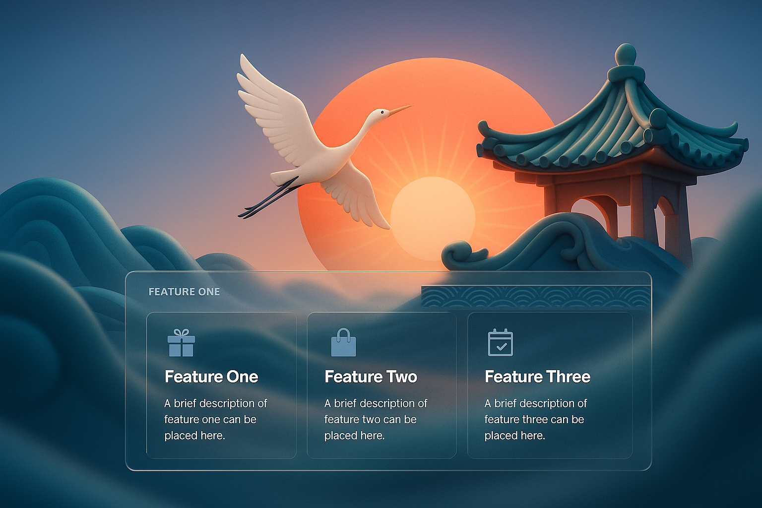 A vibrant 3D illustration showcasing a serene sunrise during the Lunar New Year, featuring a crane and traditional architecture, with text blocks for features.
