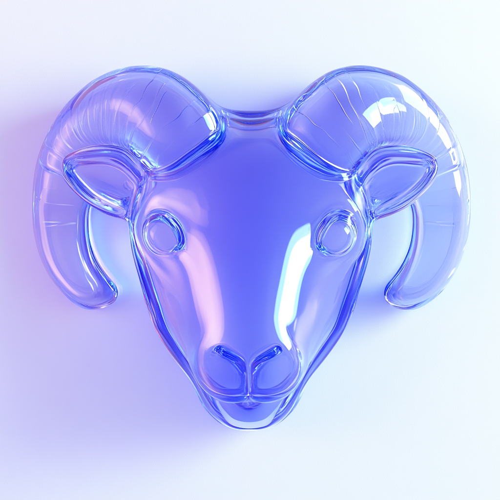 /Collection: /by davooda/Type: PNG/A modern 3D graphic of a ram's head, designed with a translucent glass effect and a blue-purple color gradient. Ideal for digital art projects or zodiac-themed designs.