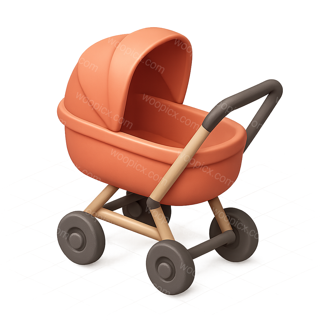 /Premium/Collection: /by davooda/Type: PNG/This image features a 3D representation of a baby stroller in a three-quarter view. The stroller has a soft orange color with a rounded canopy and a sturdy handle, designed for a contemporary look.