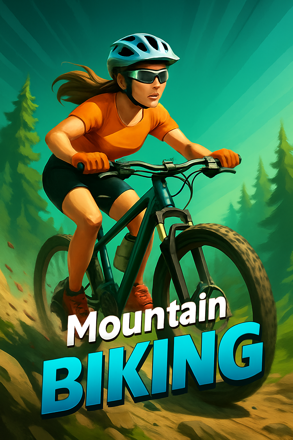 A thrilling illustration of a woman mountain biking through a vibrant forest landscape. The dynamic angle captures the excitement of the ride, with a focus on movement and energy.
