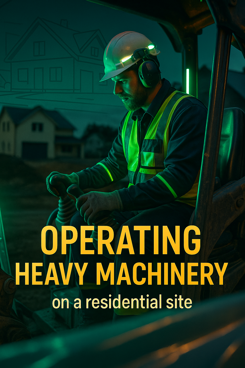 /Collection: /by davooda/Type: PNG/A dramatic image depicting a construction worker operating heavy machinery at a residential site, showcasing safety gear and focus, ideal for industry-related content.