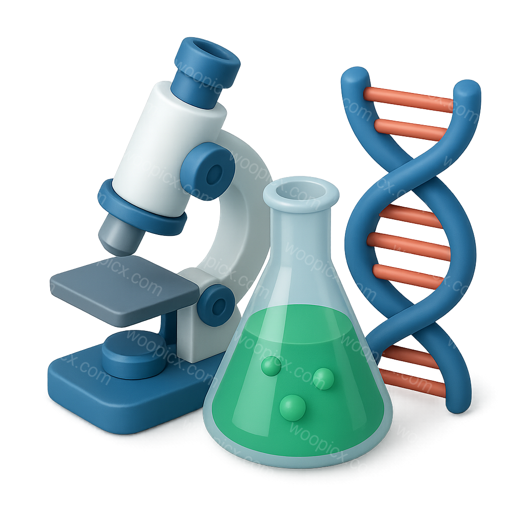 /Premium/Collection: /by davooda/Type: PNG/A colorful 3D illustration featuring a microscope, a green flask, and a DNA helix. The icon showcases a modern synthetic biology lab theme with a transparent background.