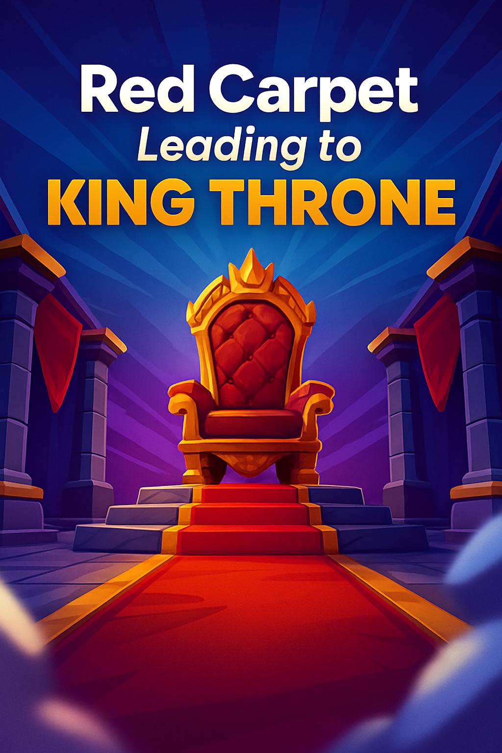 A vibrant red carpet leads to an opulent king's throne, set against a dynamic backdrop. The throne is adorned with rich details, emphasizing royalty and grandeur.