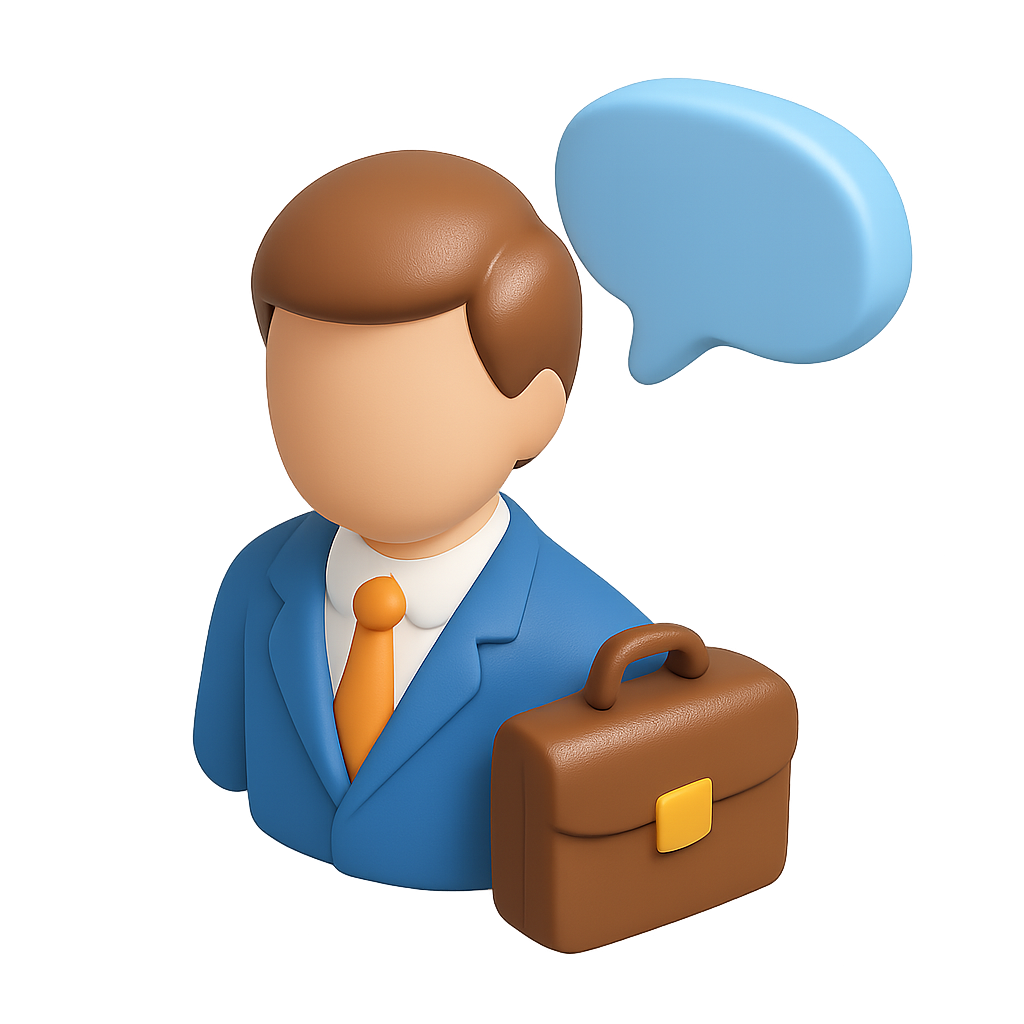 An isometric 3D icon featuring a faceless character in a blue suit holding a briefcase, accompanied by a blue speech bubble, set against a dark background.