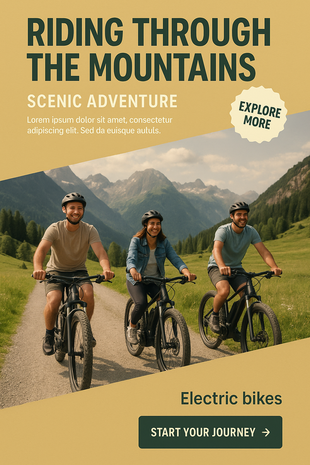 Three friends ride electric bicycles through a stunning mountain landscape, showcasing camaraderie and adventure. The vibrant scenery enhances the thrill of the journey.
