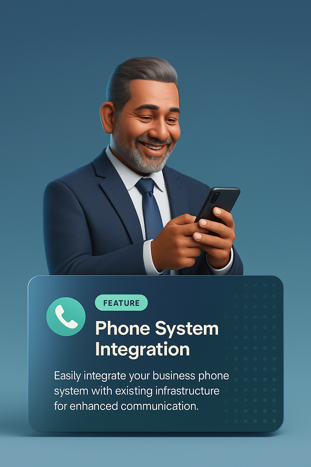 Smiling Businessman with Phone and Innovative Design Features