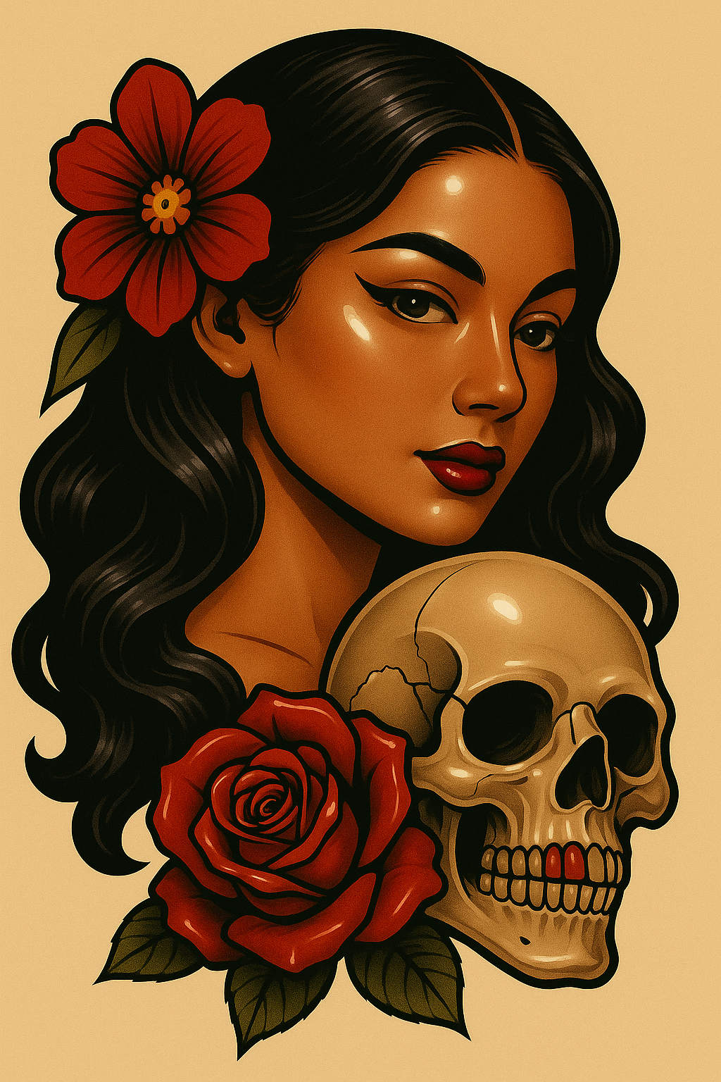 Stylized Tattoo Art of a Woman with Skull and Roses