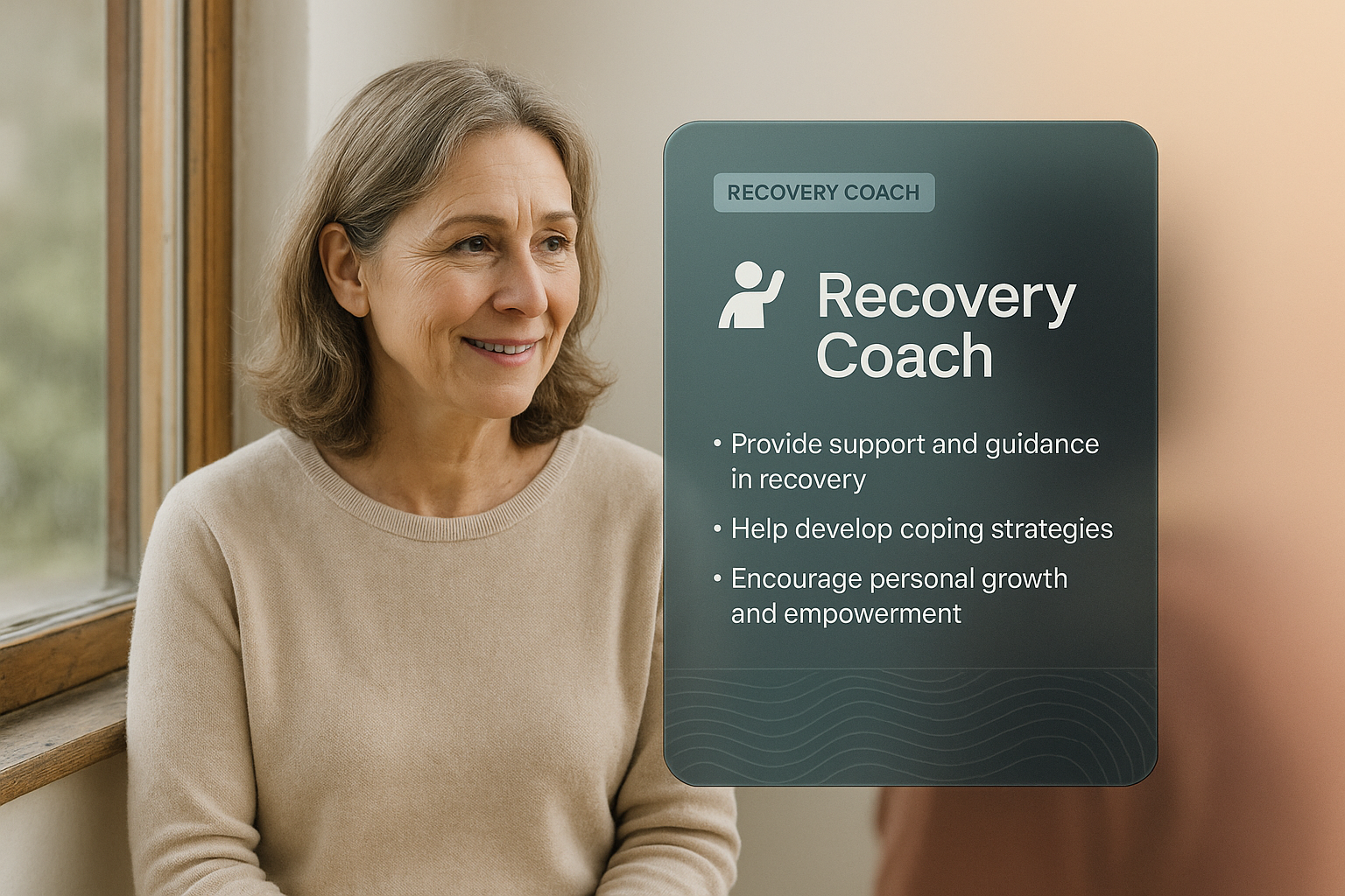 /Collection: /by davooda/Type: PNG/A visually appealing web page design featuring a Recovery Coach. The layout includes a clear gradient background, an integrated information block with supportive text, and a friendly portrait.