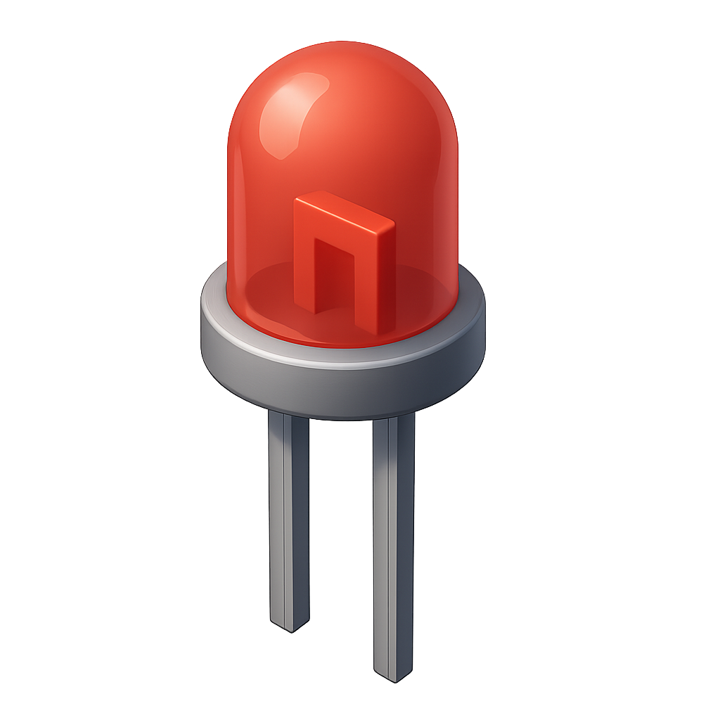 A visually striking 3D icon of a red LED diode, featuring a transparent background and a three-quarter view. The design includes a metal base with two pins and a geometric shape inside the dome.