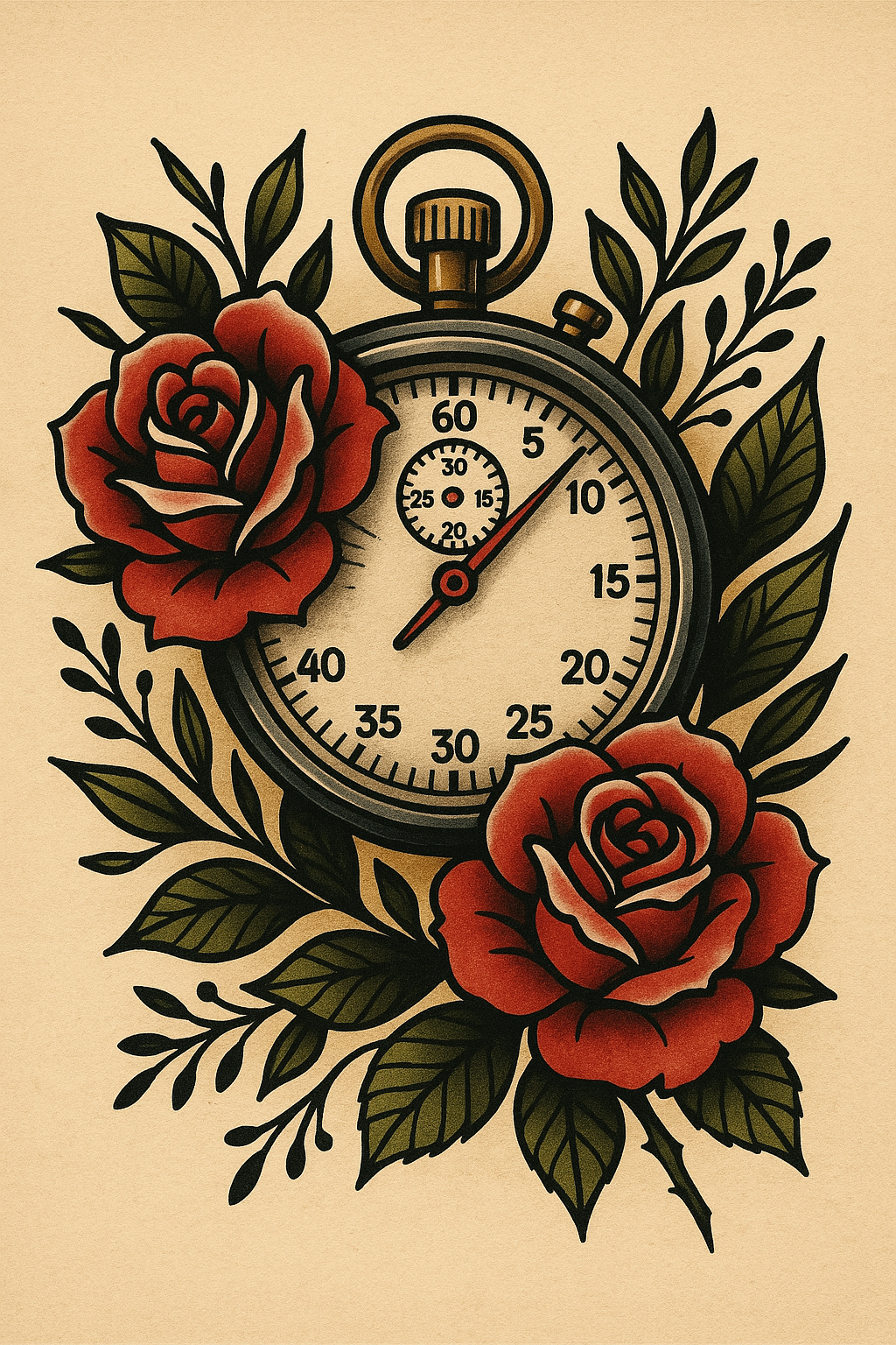 Vintage Stopwatch Surrounded by Roses in a Retro Tattoo Style