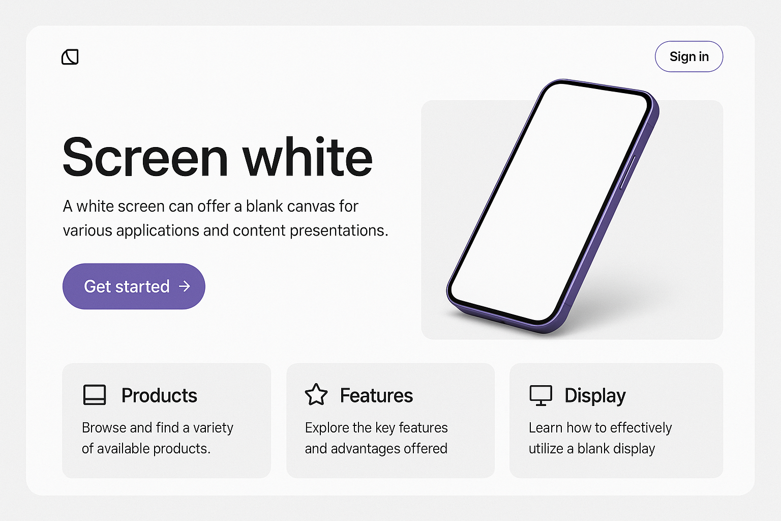 /Collection: /by davooda/Type: PNG/A clean and modern landing page design featuring a purple smartphone with a blank screen. It includes sections for products, features, and display, encouraging user engagement.