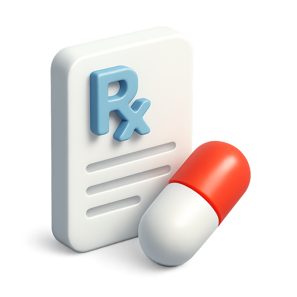 /Collection: /by davooda/Type: PNG/A 3D icon featuring a prescription pad and a red and white pill, rendered in a three-quarter isometric view. The design emphasizes volumetric details with a modern aesthetic.