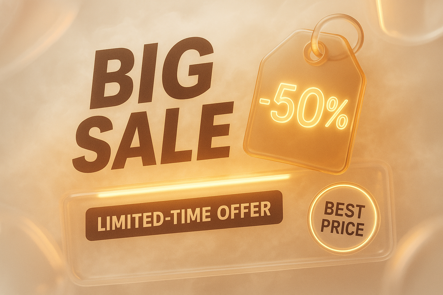 /Collection: /by davooda/Type: PNG/Dynamic promotional banner showcasing a big sale with a discount tag. The design features modern typography and a glowing effect, aimed at attracting customers during a limited-time offer.