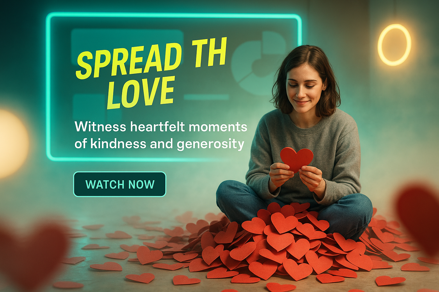 An engaging social media post showcasing a person surrounded by paper hearts, promoting moments of kindness and generosity. The vibrant colors and cozy atmosphere create an inviting and heartfelt message.