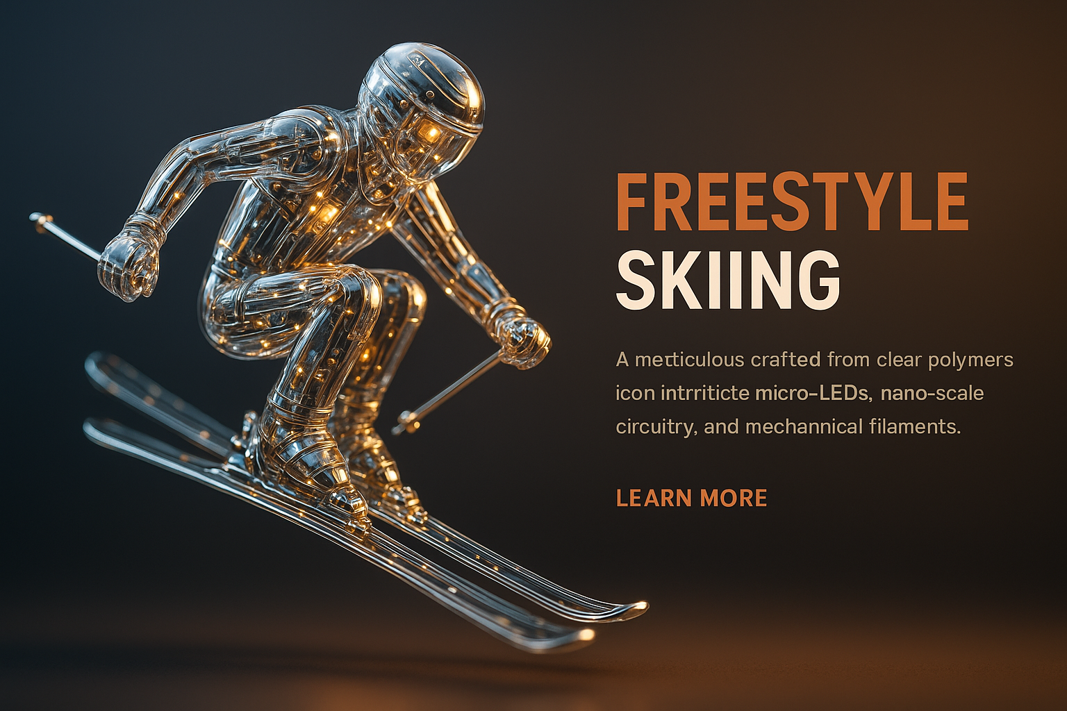 /Collection: /by davooda/Type: PNG/A hyperrealistic depiction of a freestyle skiing icon, intricately designed with glass-like polymers and glowing micro-LEDs. The composition highlights metallic components and soft lighting effects.
