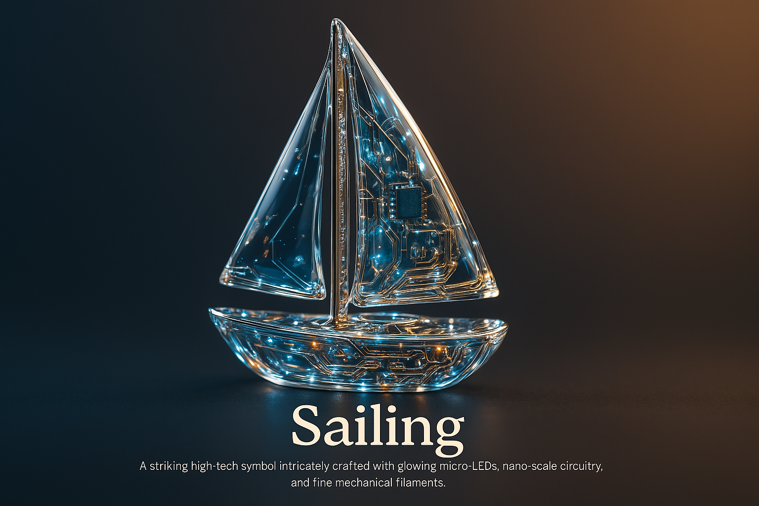 /Collection: /by davooda/Type: PNG/A hyperrealistic depiction of a sailing symbol crafted from clear polymers, showcasing glowing micro-LEDs and intricate metallic components. The design emphasizes precision and elegance.