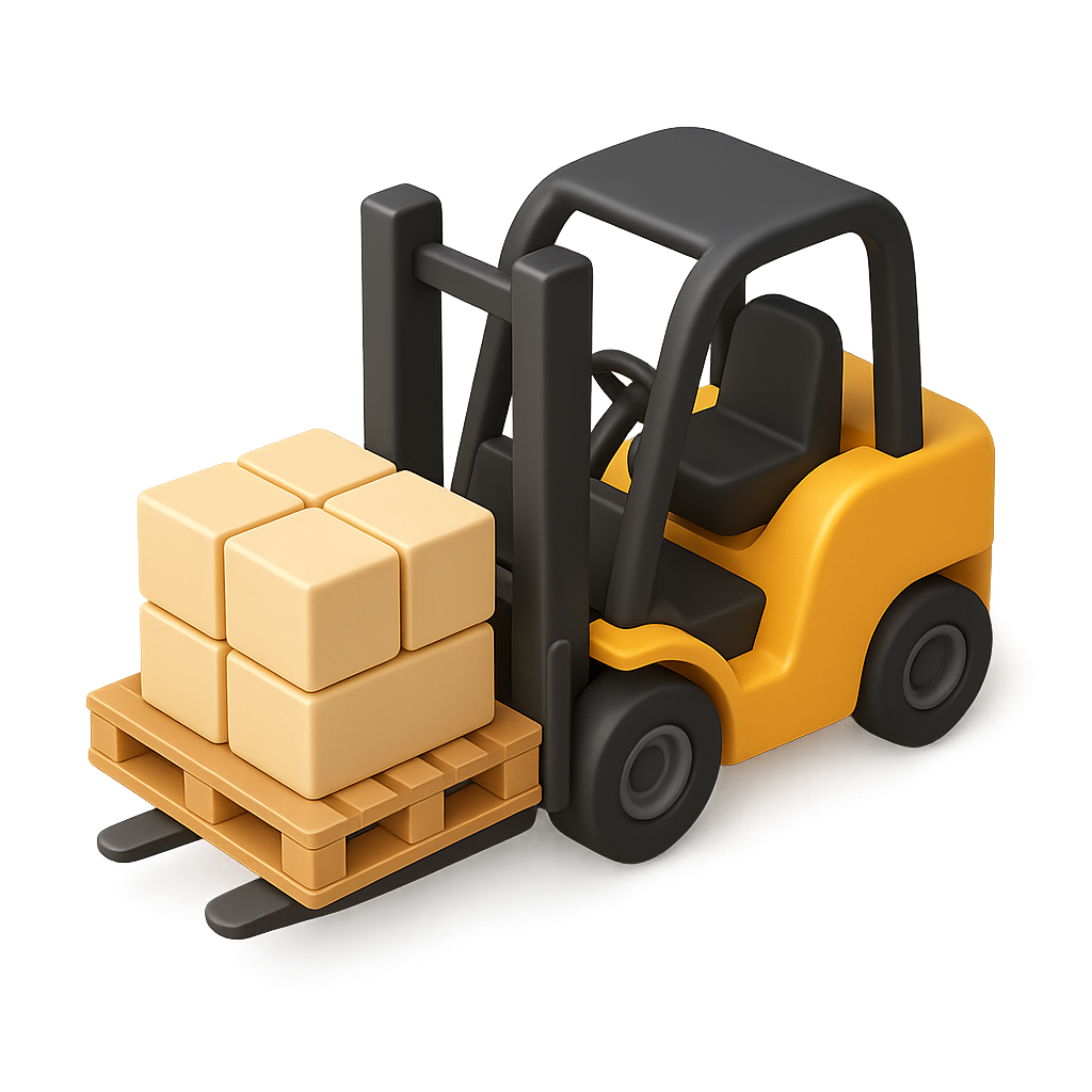 A stylized 3D icon of a forklift with a transparent background, depicted in a three-quarter view. The forklift is yellow and black, lifting a pallet of cube-shaped boxes.