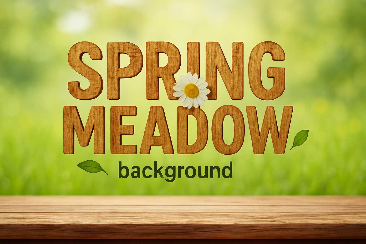 Vibrant spring meadow background featuring wooden typography and natural motifs, ideal for seasonal promotions or nature-themed projects.