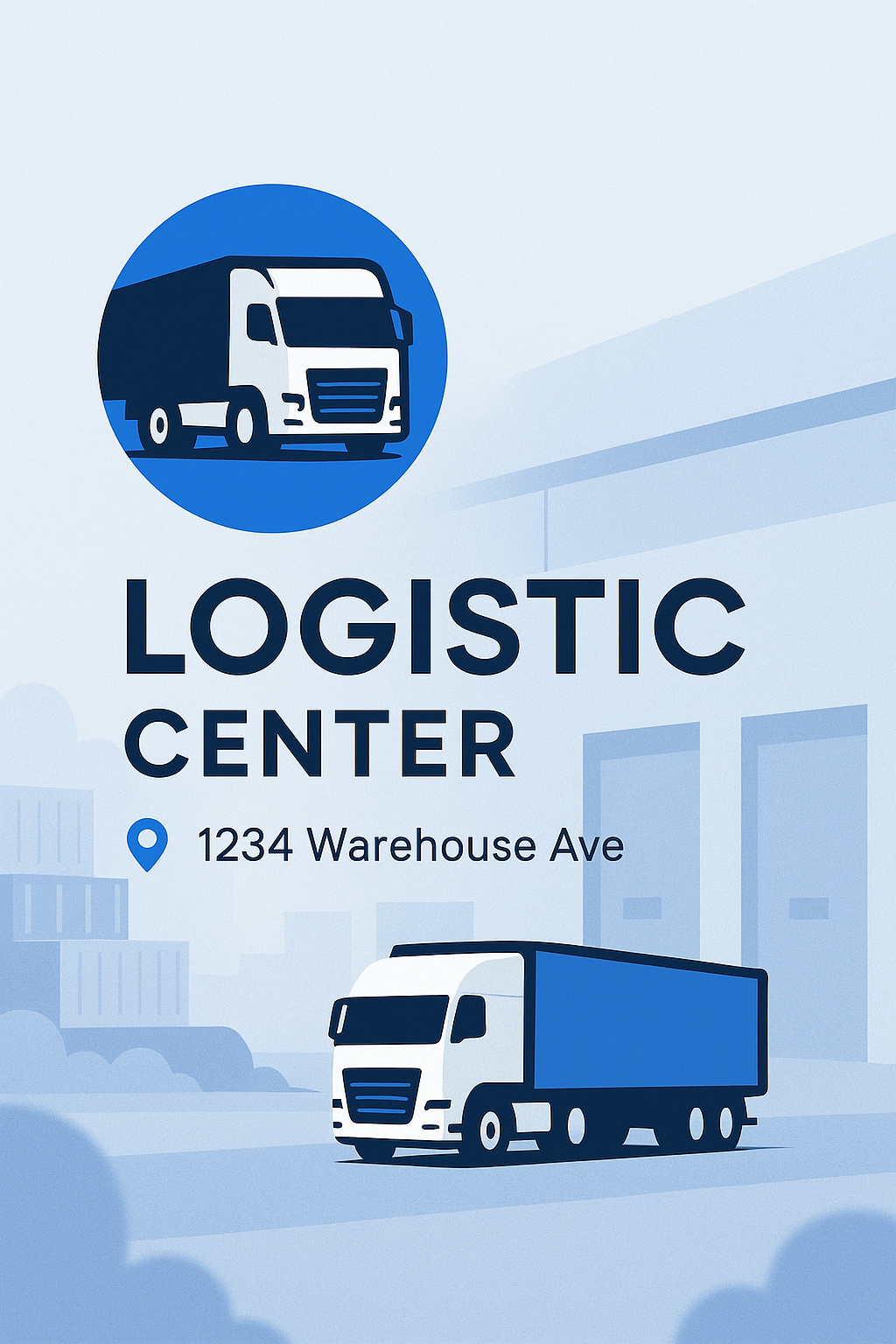 Stylized promotional graphic for a logistics center featuring modern truck illustrations, ideal for business branding or marketing materials.