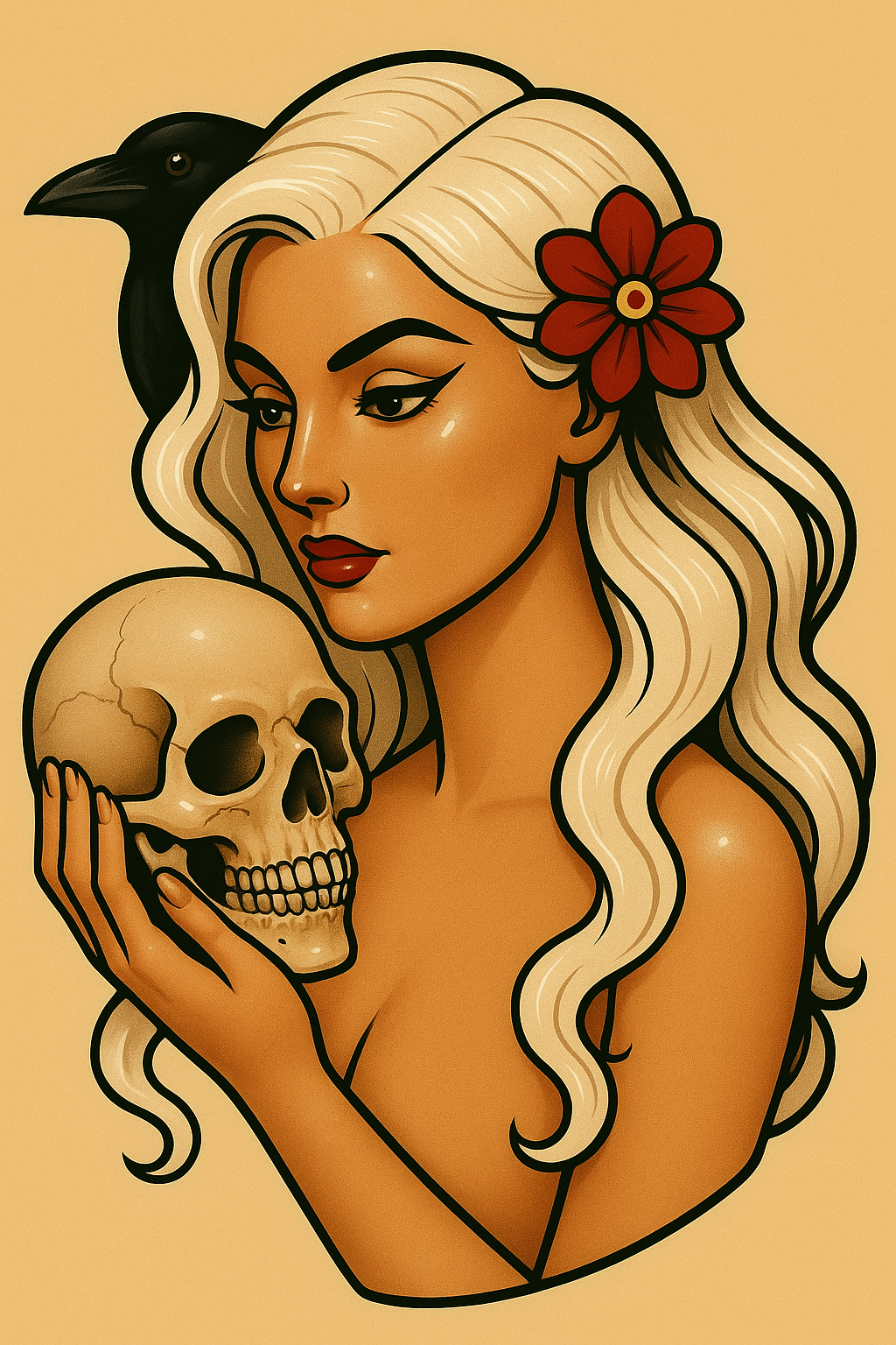 /Collection: /by davooda/Type: PNG/A beautifully stylized illustration of a woman with long, flowing white hair holding a skull, accompanied by a raven on her shoulder. The background is a soft beige, enhancing the glossy, tattoo-like quality of the artwork.