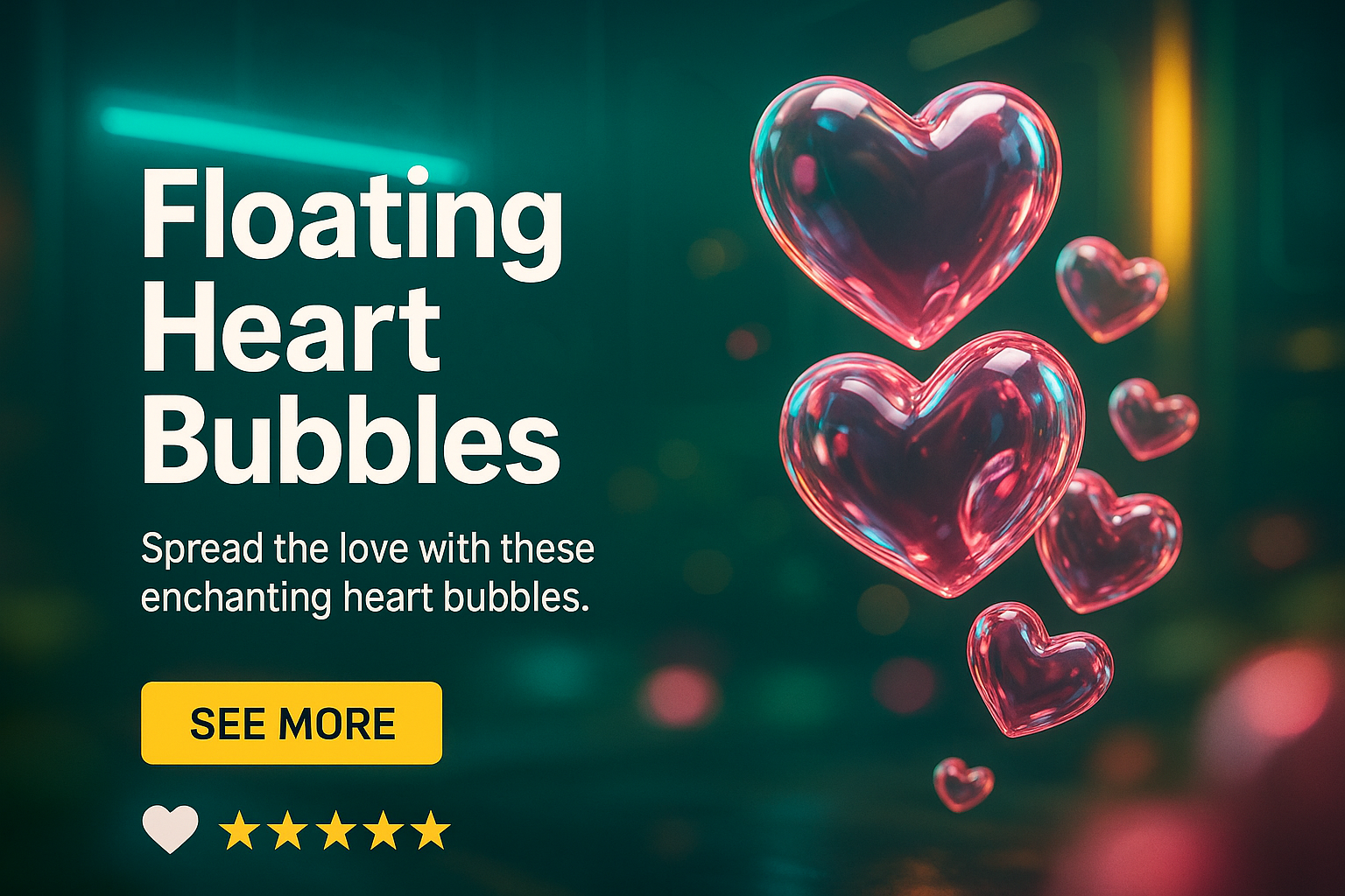 A vibrant promotional graphic showcasing floating heart-shaped bubbles against a dreamy background, ideal for love-themed marketing or events.