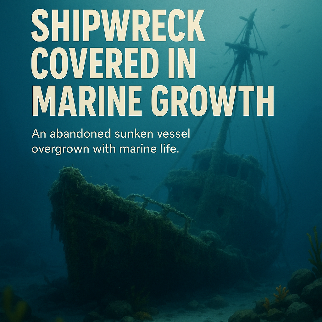 /Collection: /by davooda/Type: PNG/An underwater scene featuring a sunken ship covered in vibrant marine life. The serene blue waters provide a tranquil backdrop for this abandoned vessel, showcasing nature's reclamation.
