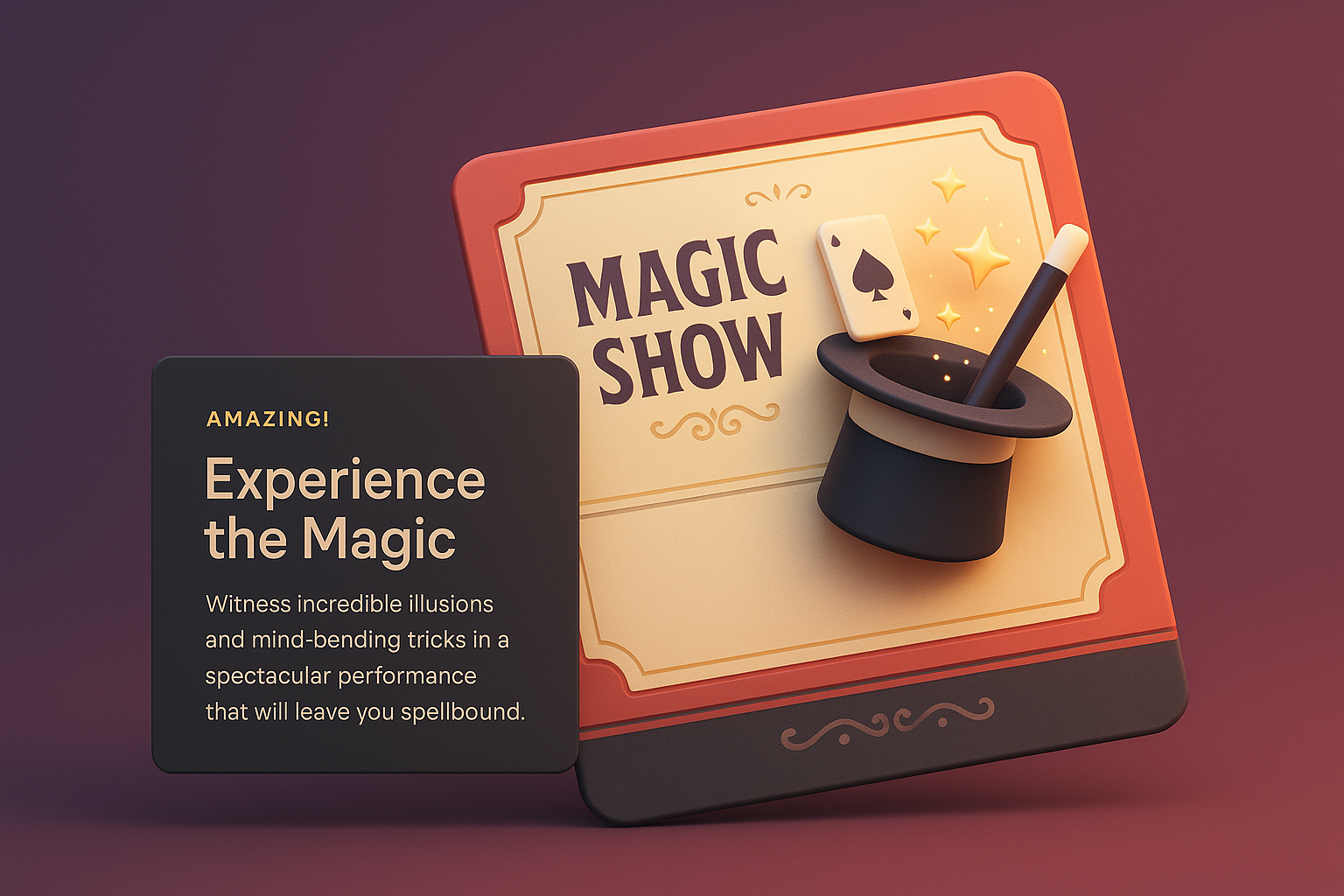 A visually captivating 3D illustration of a magic show ticket, featuring a magician's hat and playing cards. The dark banner enhances the magical theme.
