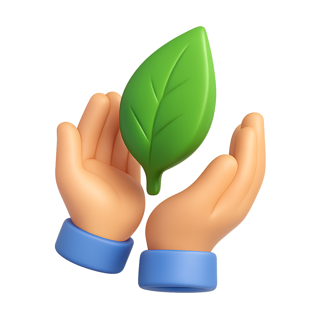 /Collection: /by davooda/Type: PNG/A vibrant 3D icon depicting hands gently cradling a green leaf. The design features a transparent background and a three-quarter view, emphasizing the volumetric and isometric style.