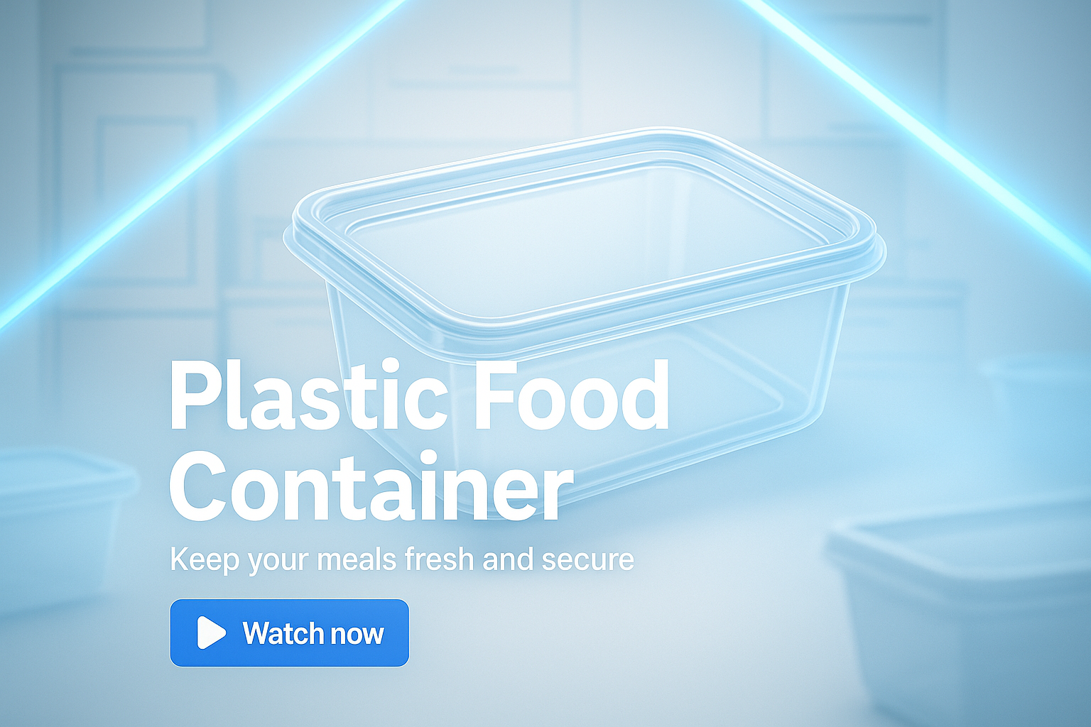Modern promotional graphic showcasing a plastic food container with a clean design, ideal for kitchenware marketing and product showcases.