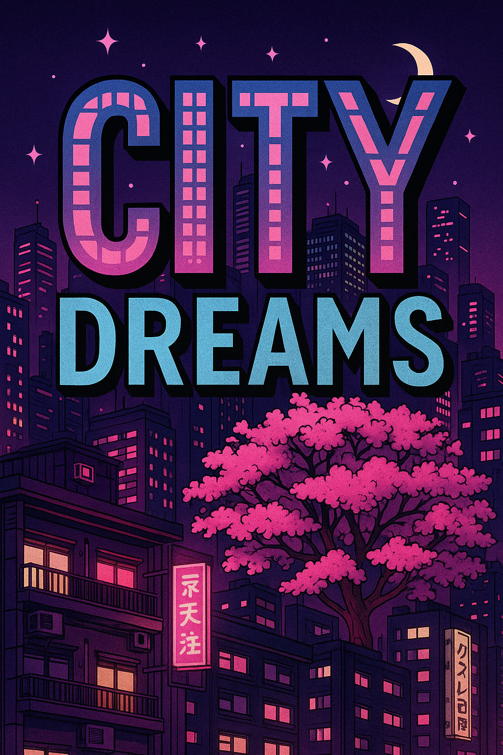 A colorful illustration depicting a nighttime cityscape with neon lights and a whimsical tree, perfect for creative projects and urban-themed designs.