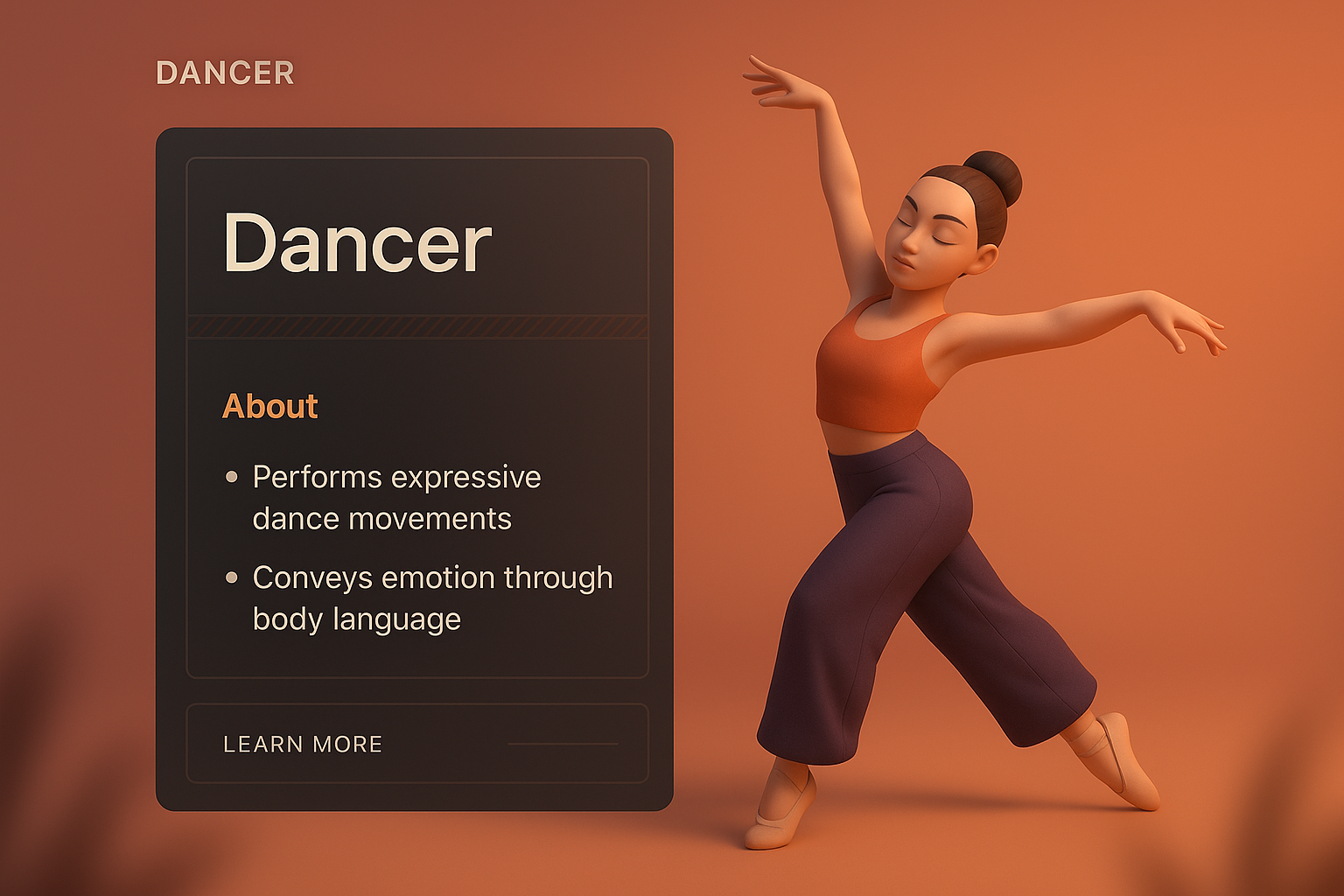 /Collection: /by davooda/Type: PNG/A captivating 3D illustration of a dancer in motion, set against a smooth gradient background. It features an integrated information panel highlighting the dancer's skills and a 'Learn More' button.