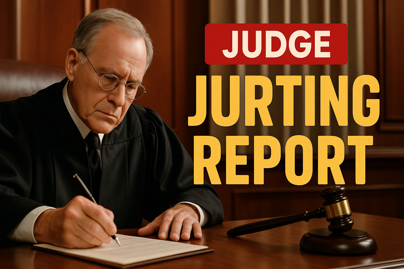 /Collection: /by davooda/Type: PNG/A courtroom scene depicting a judge in robes, focused on writing a jurting report. The image uses warm tones and strong typography, suitable for legal-themed content.