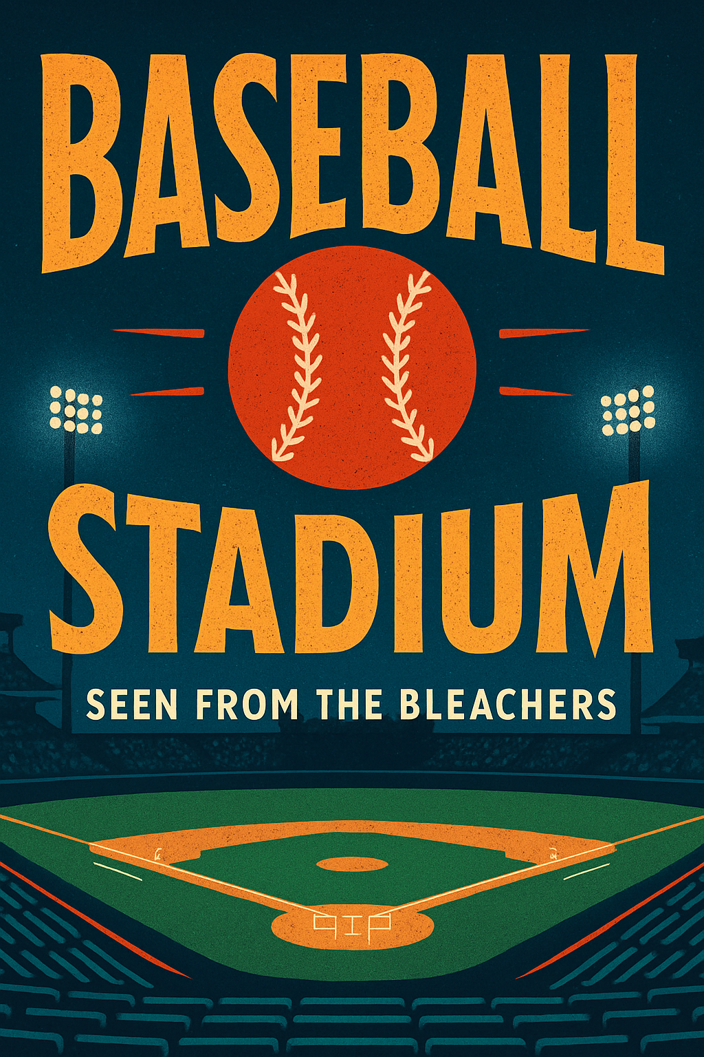/Collection: /by davooda/Type: PNG/A vibrant illustration depicting a baseball stadium viewed from the bleachers, featuring bold typography and a dramatic color palette, ideal for sports-themed promotions or event announcements.