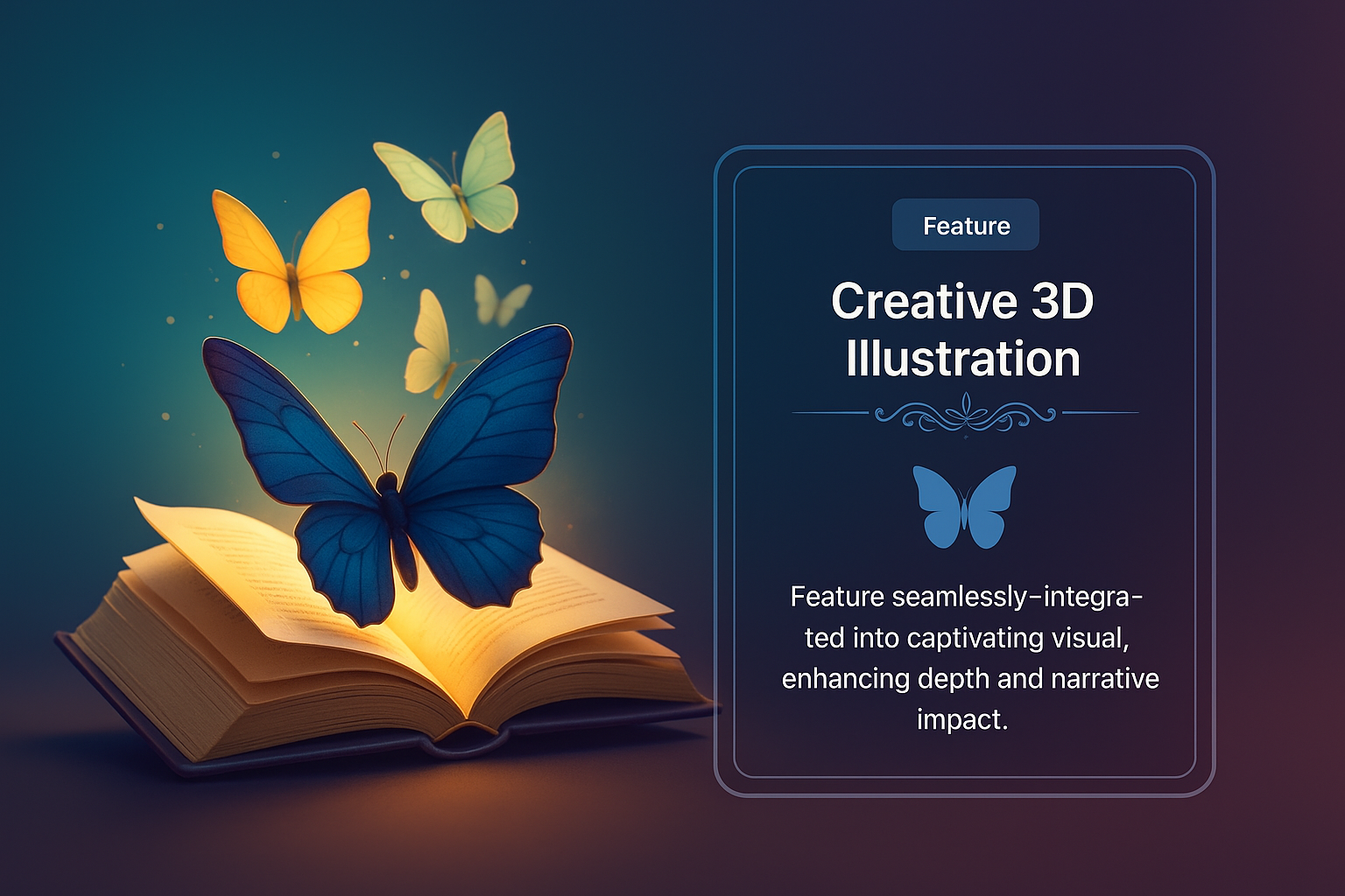 /Collection: /by davooda/Type: PNG/An enchanting 3D illustration depicts colorful butterflies emerging from an open book, symbolizing fantasy and creativity. The gradient background enhances the visual appeal.