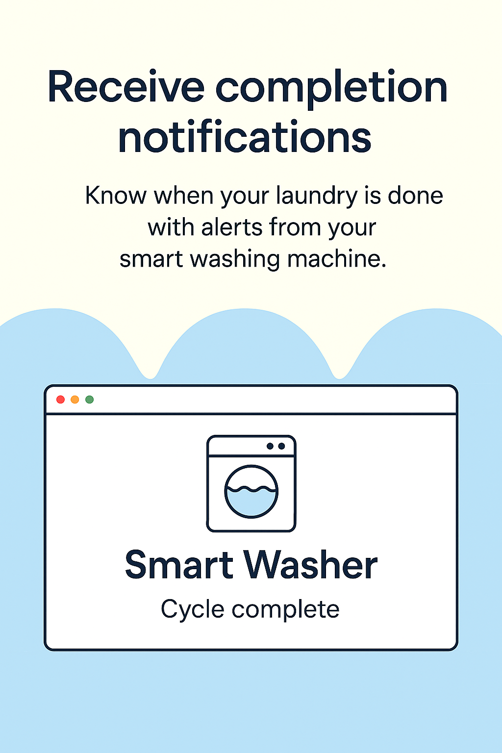 /Collection: /by davooda/Type: PNG/Informative graphic illustrating laundry completion notifications for a smart washing machine, featuring a clean and modern design suitable for tech product marketing.