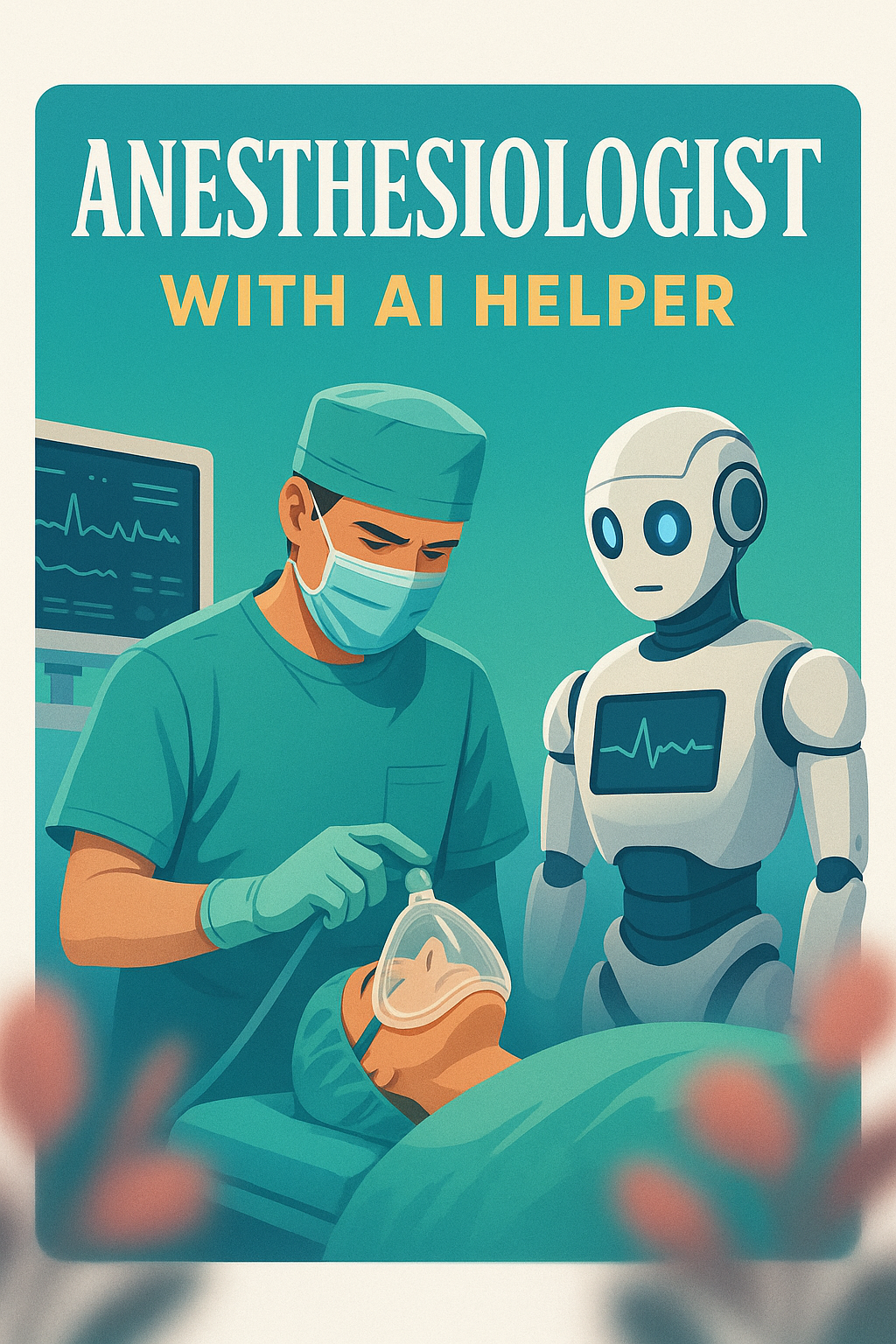 /Collection: /by davooda/Type: PNG/A vibrant illustration of an anesthesiologist in scrubs administering anesthesia with the assistance of a humanoid AI robot. The scene captures a blend of technology and healthcare, featuring a two-tone gradient background.