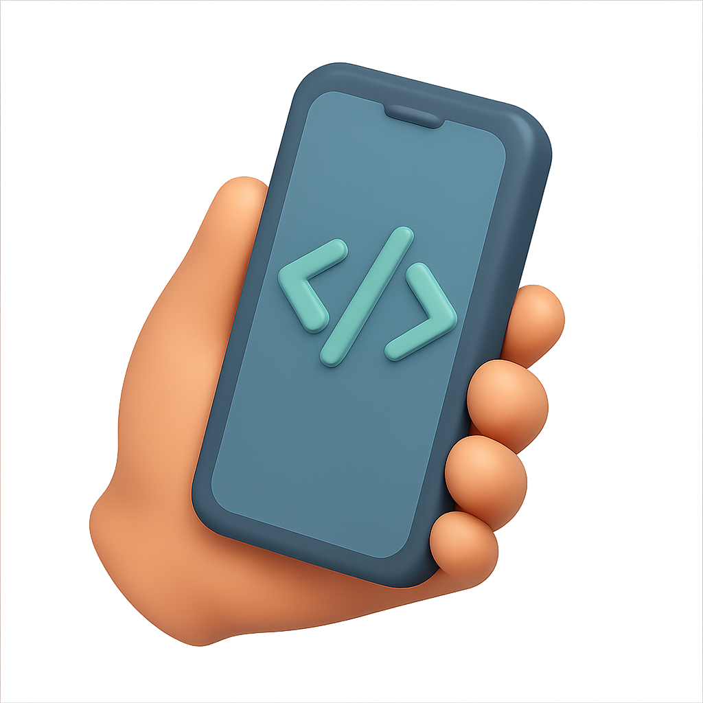 A stylized 3D icon of a hand holding a smartphone. The phone displays coding symbols on its screen, set against a soft blurred background.