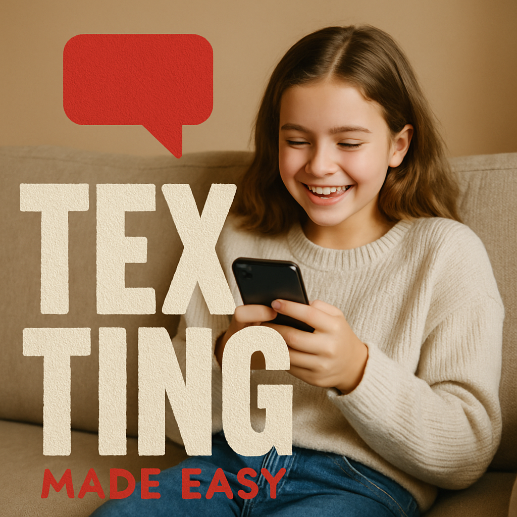 /Collection: /by davooda/Type: PNG/A vibrant social media post featuring a young girl smiling while using her phone, emphasizing the theme of making texting easy. The design combines playful typography with a warm color palette, ideal for educational content aimed at a younger audience.