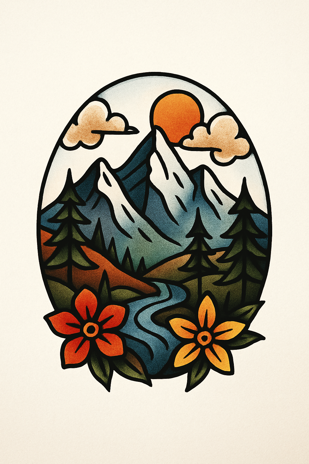 Vibrant illustration featuring a scenic mountain landscape with stylized flowers and a sun, perfect for nature-themed art, prints, or merchandise.