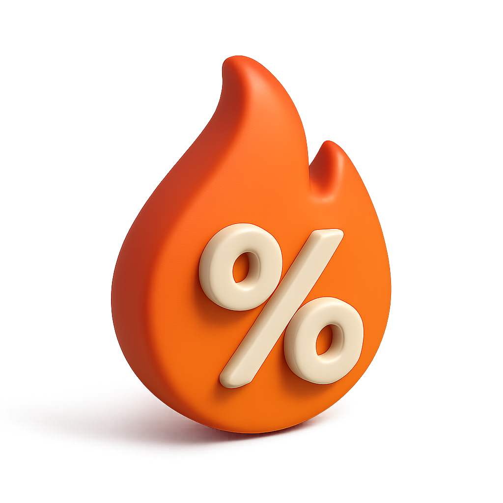 /Collection: /by davooda/Type: PNG/A vibrant 3D icon depicting a flame shape with a percentage sign. The design features a smooth, volumetric appearance and a transparent background, showcasing an isometric perspective.