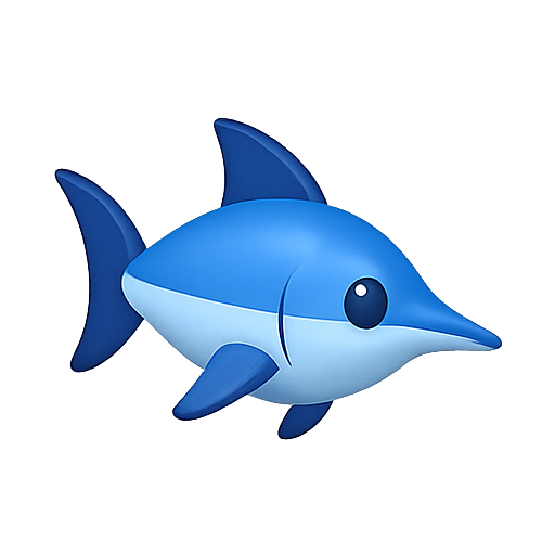 A playful cartoon-style blue fish character featuring a rounded body, large eyes, and a simplistic design. Ideal for digital communication and playful branding.