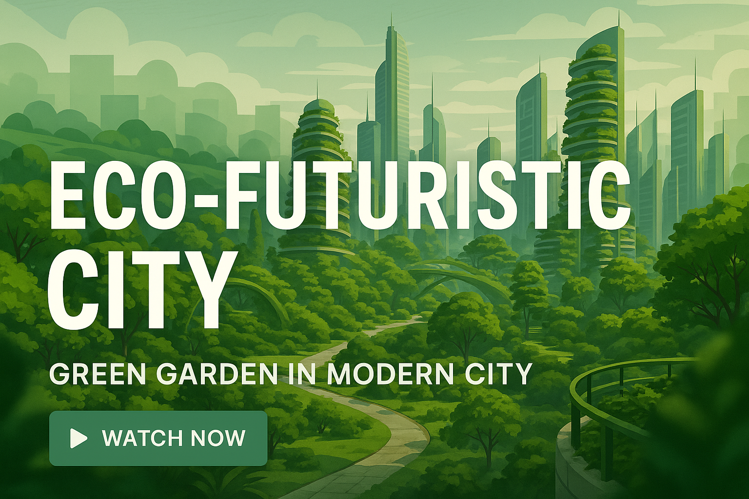 A vibrant illustration depicting an eco-futuristic cityscape with lush greenery integrated into modern architecture, ideal for environmental awareness campaigns.