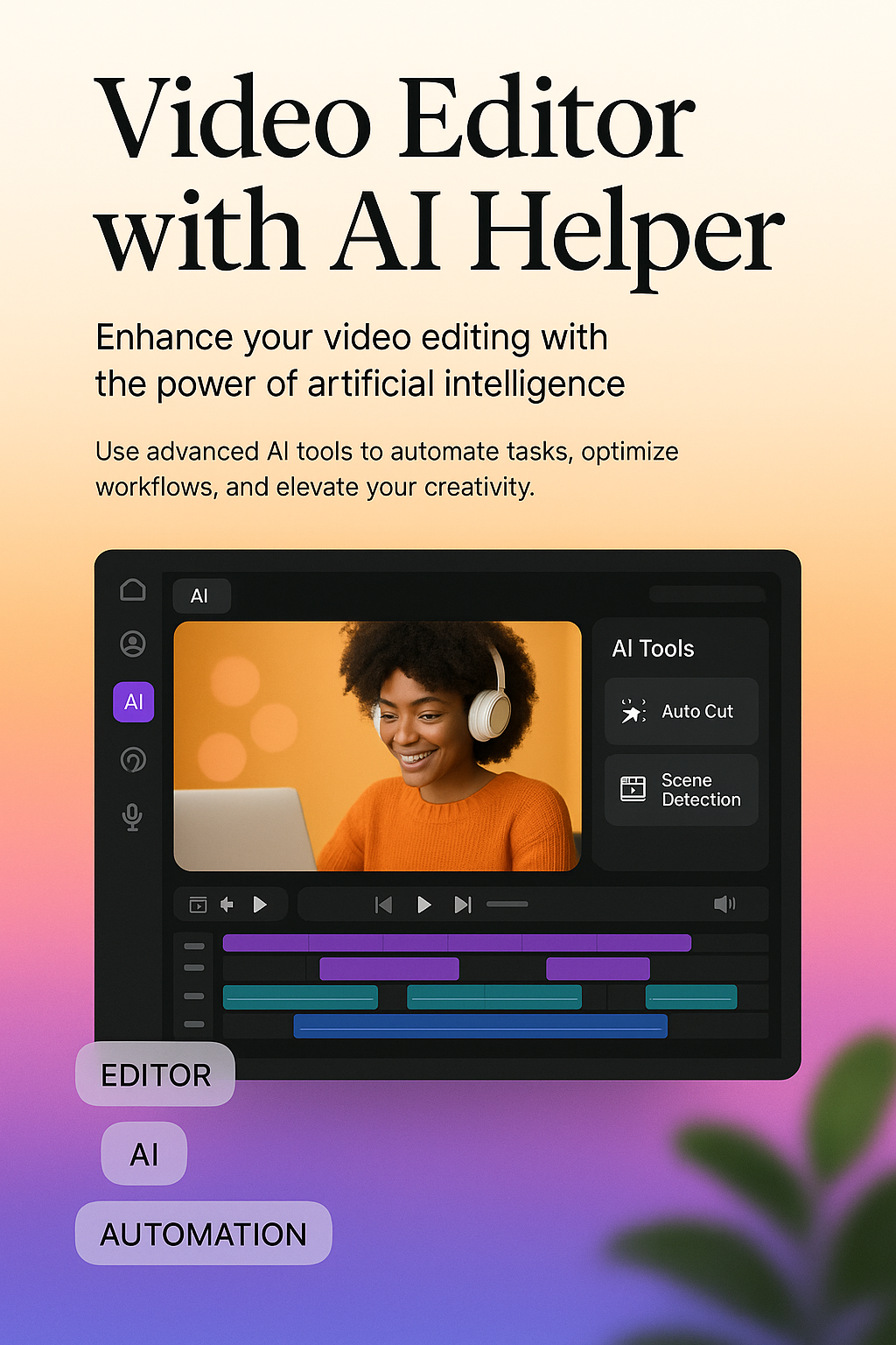 /Collection: /by davooda/Type: PNG/A visually appealing web landing page design showcasing a video editor with AI assistance. Features a gradient background, contrasting fonts, and an engaging layout.