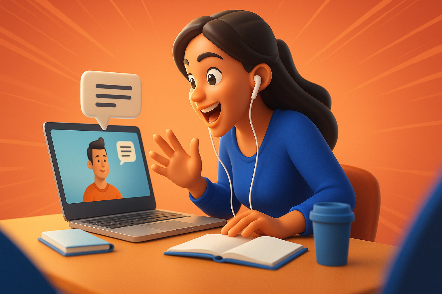 /Collection: /by davooda/Type: PNG/A vibrant illustration of a young woman engaged in a virtual meeting from her home office. She is smiling, wearing earbuds, and communicating via laptop, surrounded by dynamic elements that enhance the engaging atmosphere.