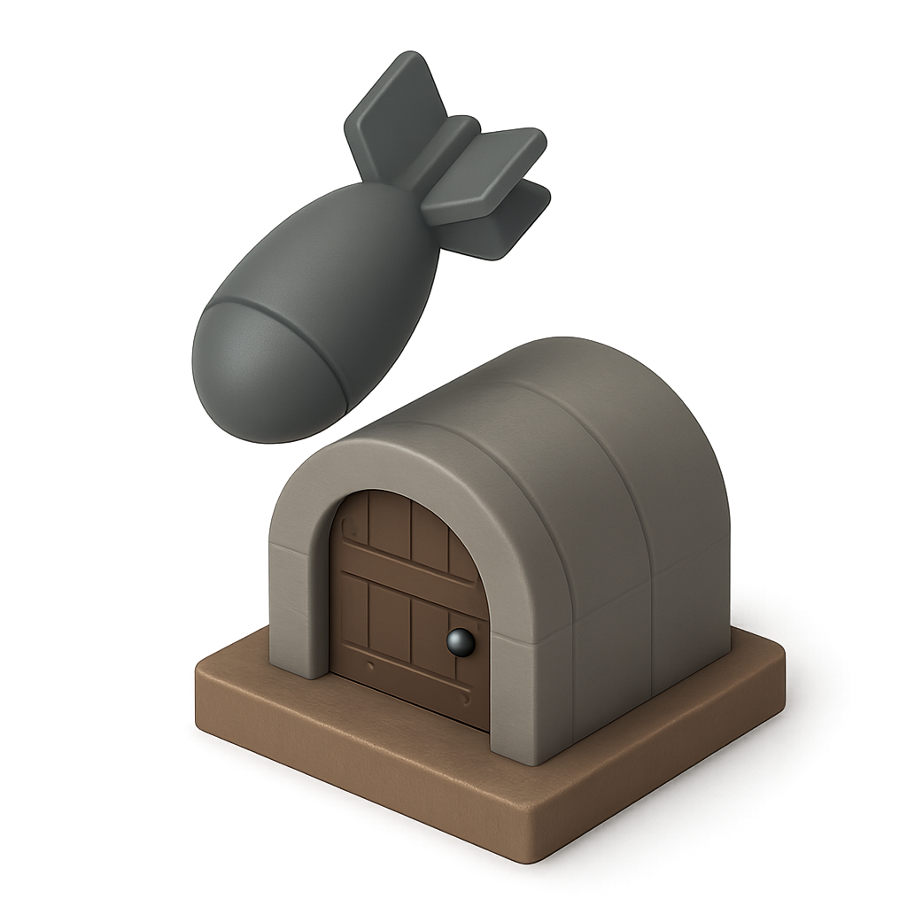 /Collection: /by davooda/Type: PNG/This image features a stylized 3D bomb shelter icon, showing a curved roof and wooden door, with a bomb hovering above. The design is isometric and volumetric, enhancing its three-dimensional feel.