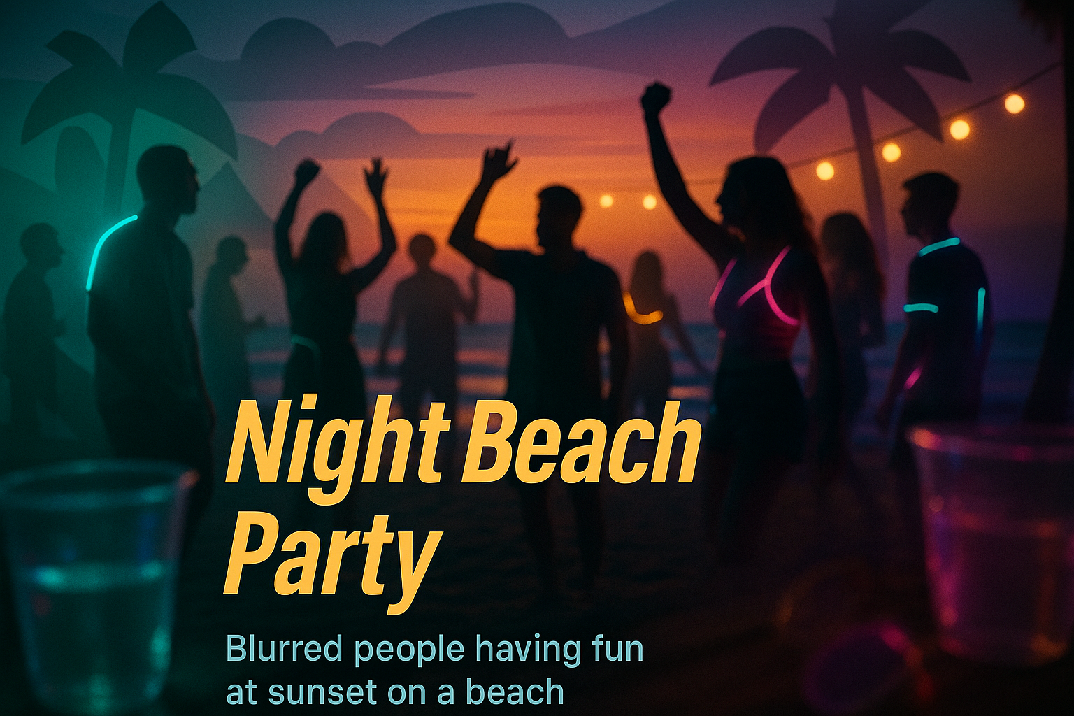 Vibrant Night Beach Party Scene with Silhouetted Figures